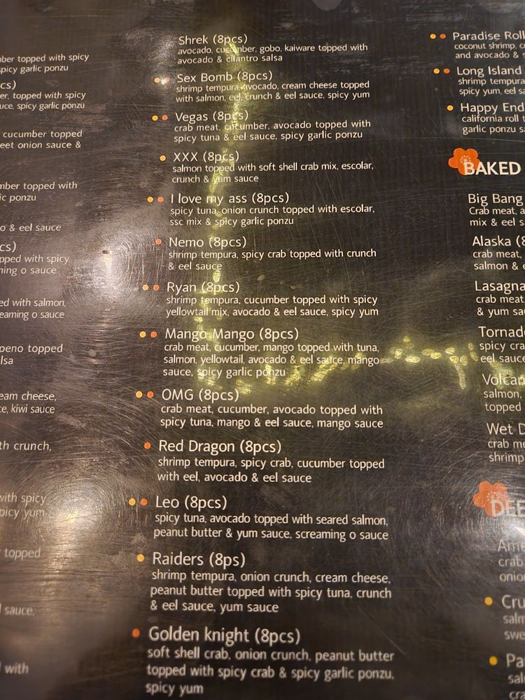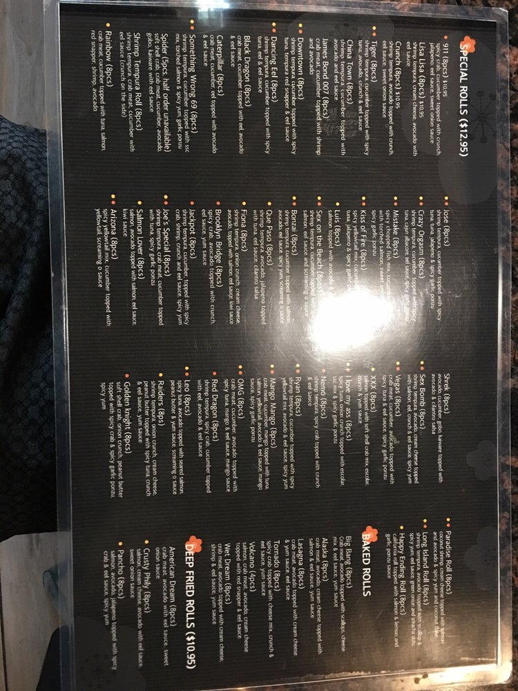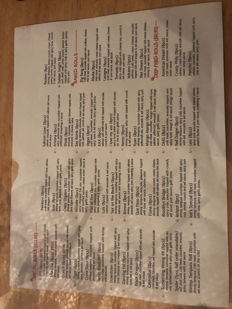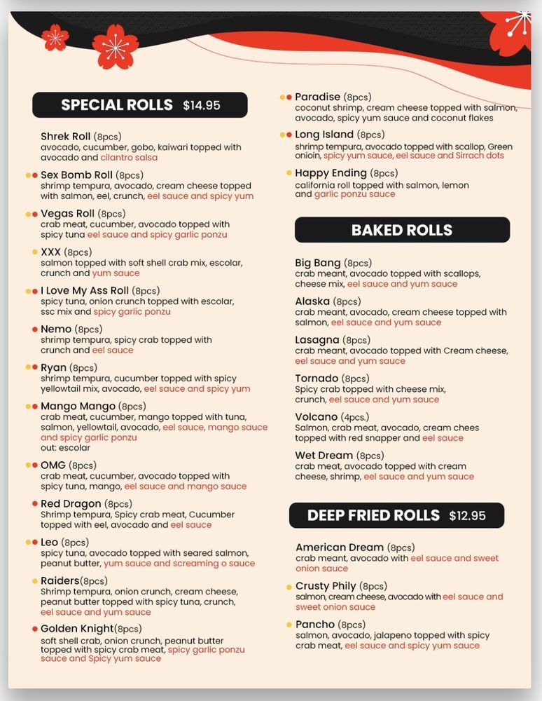 8 pieces. Raw. Shrimp tempura, onion crunch, cream cheese, peanut butter topped with spicy tuna, crunch and eel sauce, and Yum sauce.