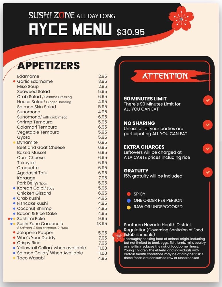 Sushi Zone - Temp. CLOSED, located at 4545 Spring Mountain Rd Ste 101 in Las Vegas, offers a variety of Japanese cuisine options. The menu includes a selection of appetizers such as Edamame, Miso Soup, and Dynamite rolls. For sushi lovers, there are options like Salmon Sushi, Albacore Sushi, and Sea Urchin Sushi. Customers have praised the friendly staff, quick service, and family-friendly atmosphere. Special promotions for takeout are available, making it a budget-friendly option for sushi enthusiasts. With a focus on fresh ingredients and traditional flavors, Sushi Zone provides a satisfying dining experience for both sushi novices and connoisseurs alike.